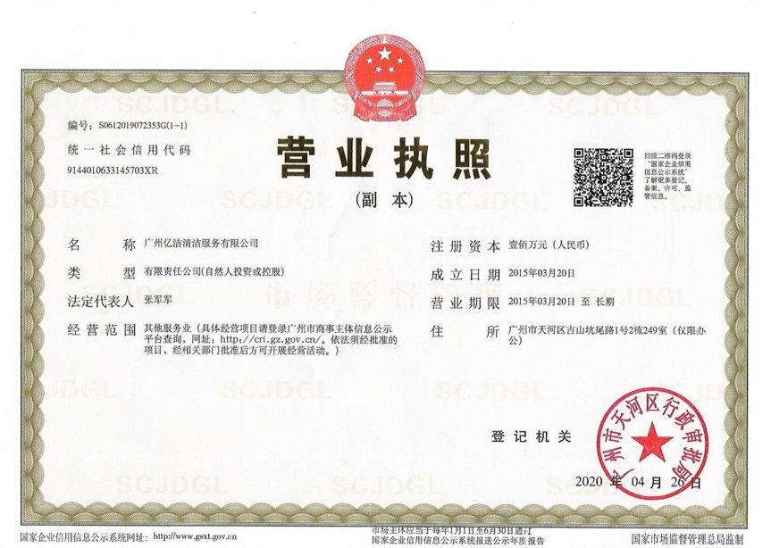 廣州億潔清潔服務有限公司是經廣州市工商行政管理局批準成立的(注冊資本:100萬元人民幣)。具有獨立法人資質。公司成立2015年,公司具備完善的管理體系和高素質管理隊伍,擁有特種技術人員33名,保潔服務人員上萬名,覆蓋廣州市,能及時調配并快速投入高效運行。我們的每個員工都經過公司的嚴格篩選,嚴格培訓,定期培訓后持證上崗以保證服務品質,保障客戶的權利,利益,形象等不受損失。 廣州億潔清潔公司是一家設備齊全,技術強大的綜合型清潔服務公司,為客戶提供完善服務尊定了堅定的基礎。 司于2010年全面推行了ISO9001質量管理體系認證和ISO14001國際環(huán)保體系認證。先后獲得廣州高層建筑外墻清洗維修作業(yè)【安全資質證書】、【廣州環(huán)衛(wèi)企業(yè)等級證書C級資質】、廣州疾控中心頒發(fā)的【四害消殺服務資質證】、【空氣治理A級資質】、中國石材協(xié)會頒發(fā)的【石材資質B級資質】等。 廣州億潔清潔服務有限公司致力于打造專業(yè)、實惠、靠譜的保潔服務公司,把專業(yè)的事情交給專業(yè)的我們,您放心! 億潔清潔服務項目: 廣州保潔服務:新建樓宇、別墅、酒店、醫(yī)院、辦公樓、賓館、企事業(yè)單位廠房竣工后開荒及裝修后精細保潔.工程保潔服務。 廣州物業(yè)托管:為廣州市各大企事業(yè)單位、賓館、政府機關、小區(qū)物業(yè)、酒店及廠房提供專業(yè)化保潔、園林、設施維護等管理服務。 廣州高空作業(yè):高空玻璃幕...[詳情]